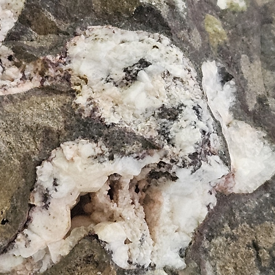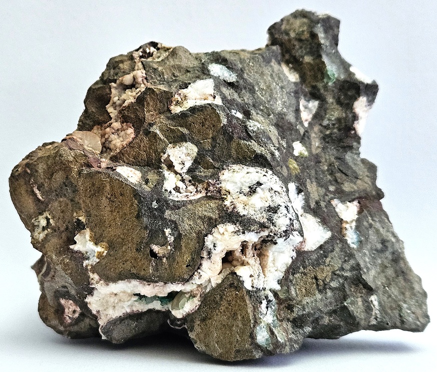 [Glassy White Crystals with Prehnite in Basalt]
