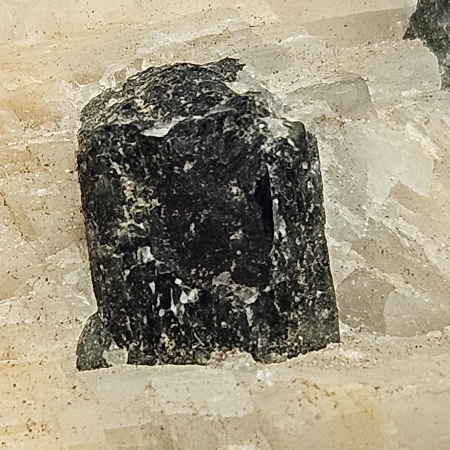 [Lustrous Dark Green to Black Euhedral Crystals in Calcite]