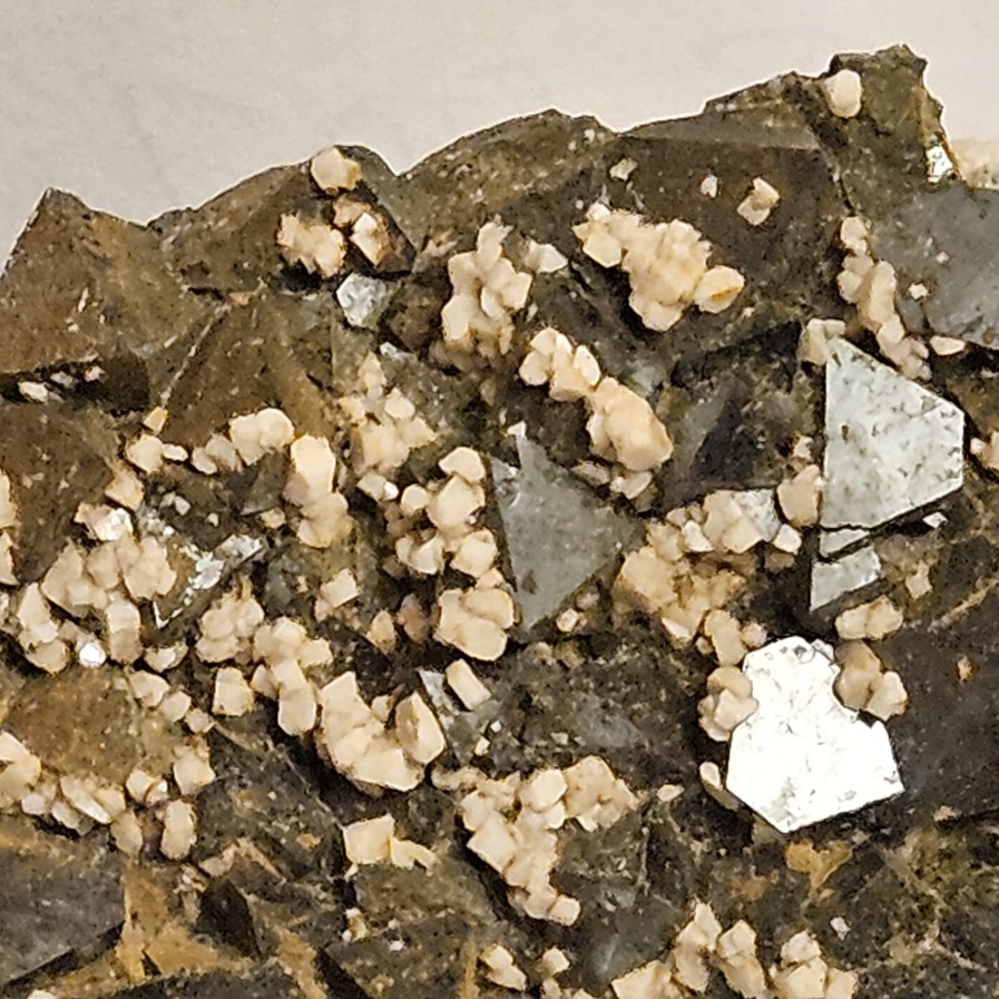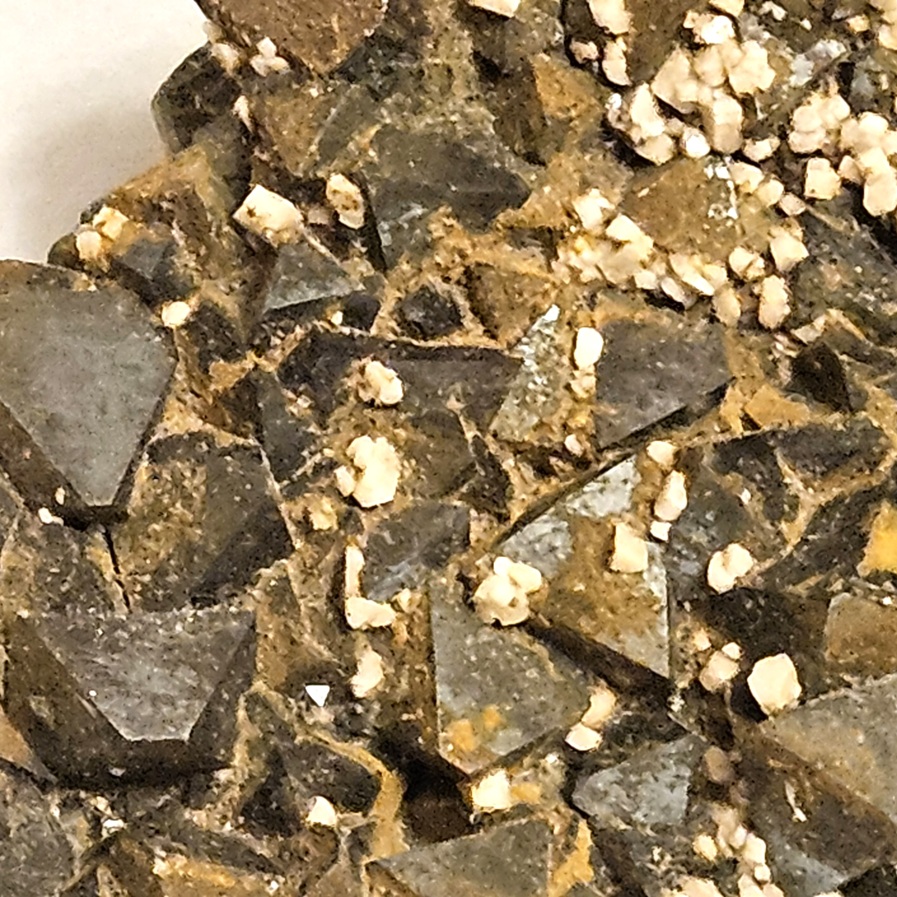 [Lustrous Metallic Black Sharp Octahedral Crystals with Tan Feldspar Crystals on Dacite]