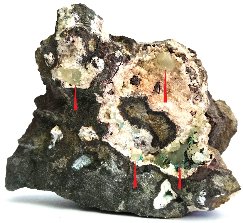 [Pale Green Botryoidal Filling White Analcime-Lined Vugs with Minor Chrysocolla and Chalcocite in Basalt]