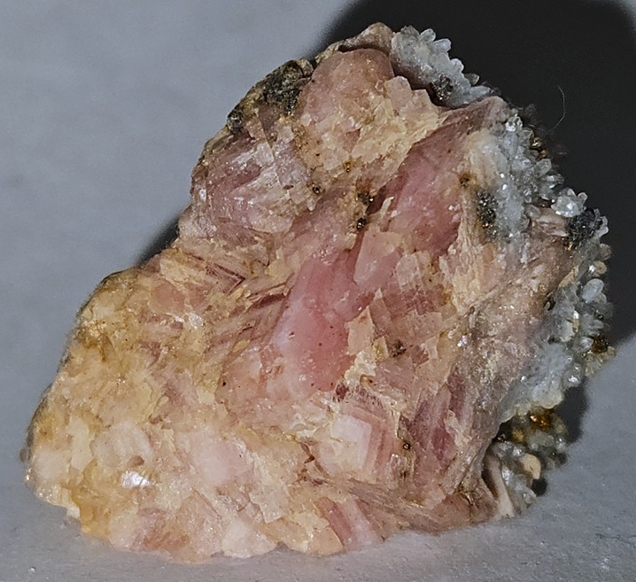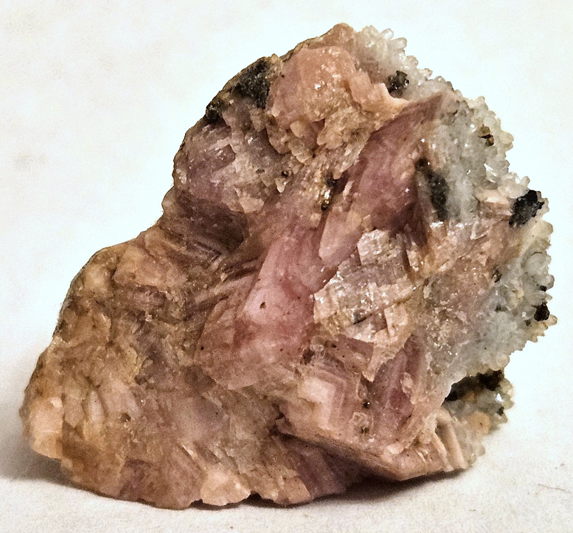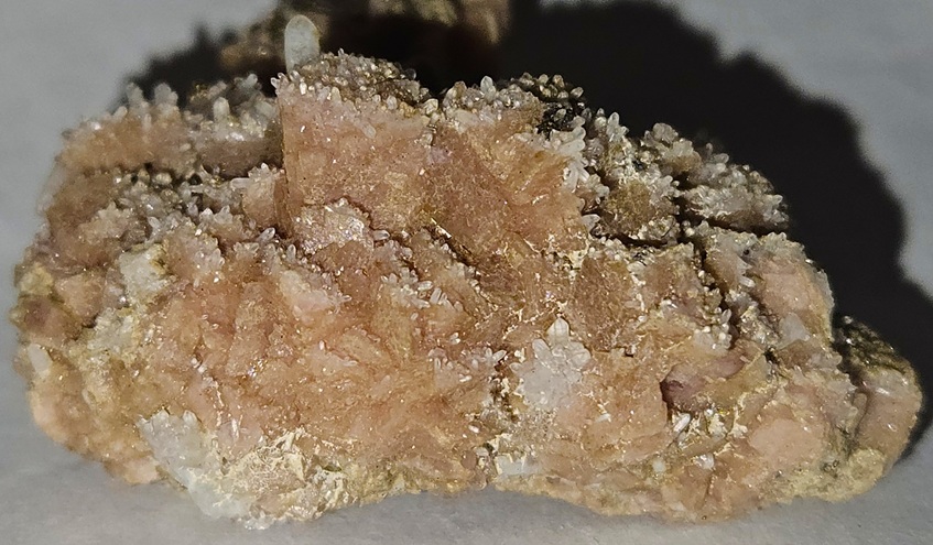 [Salmon-Pink Rhombohedral Crystals with Drusy Quartz]
